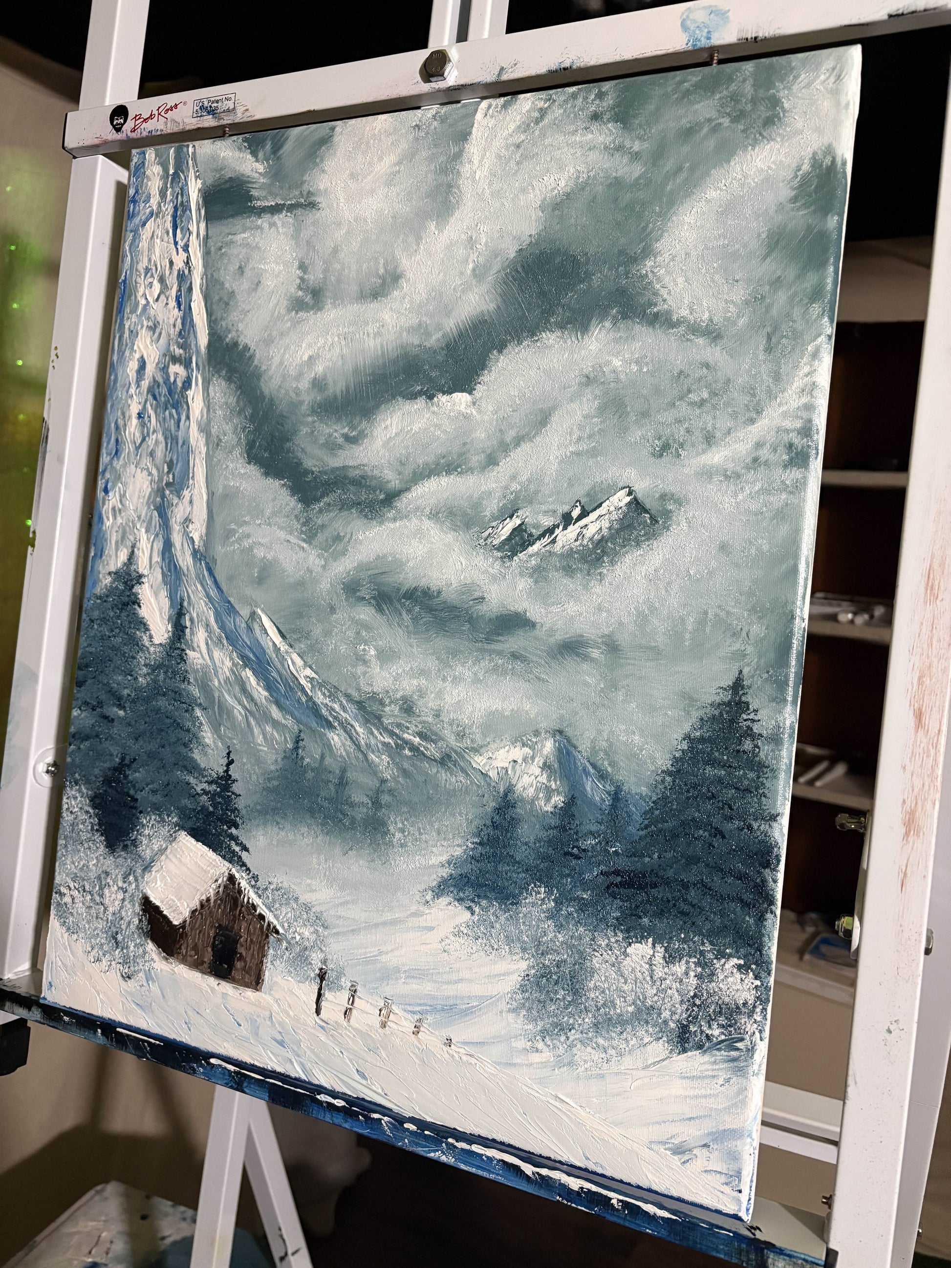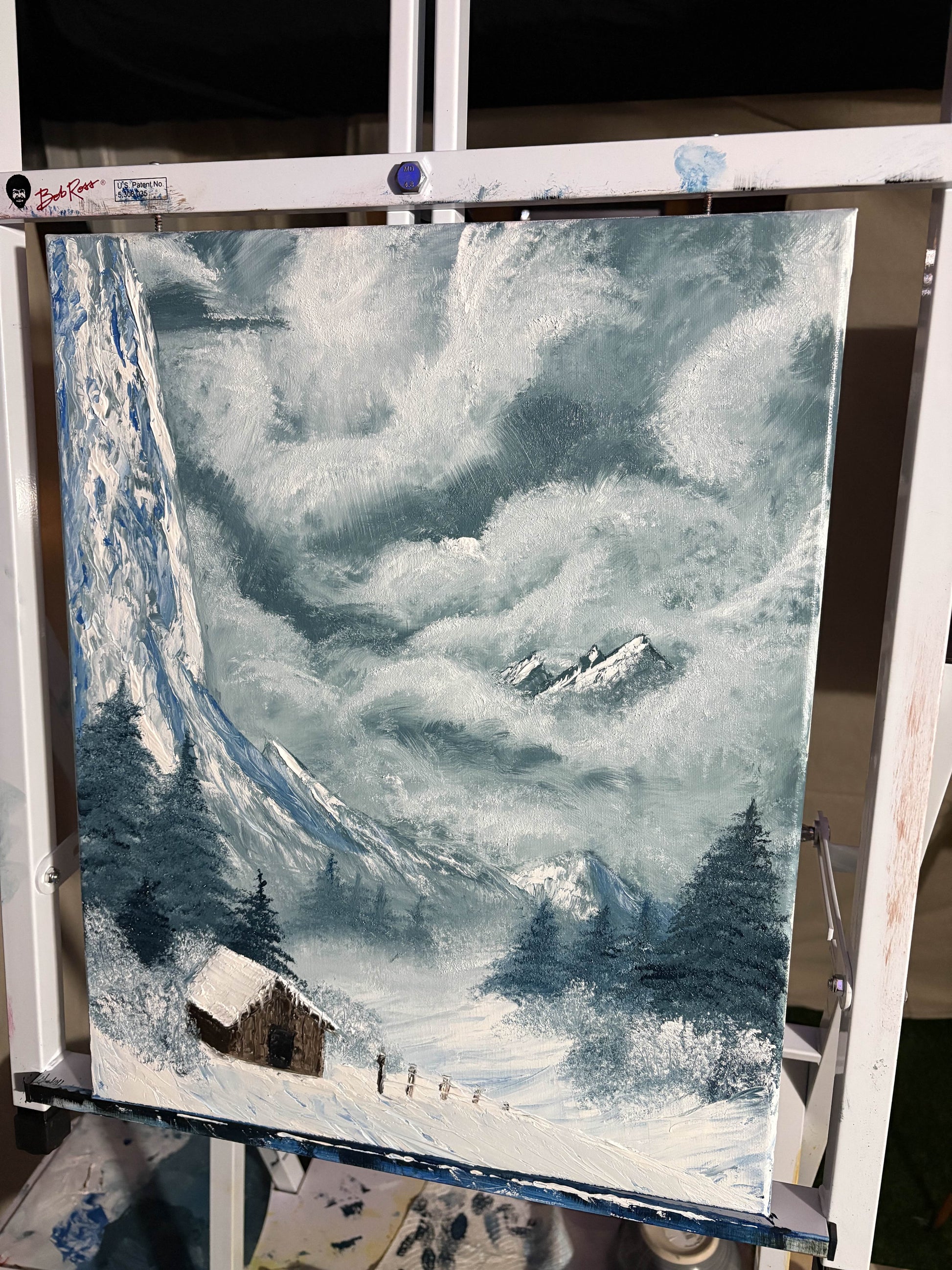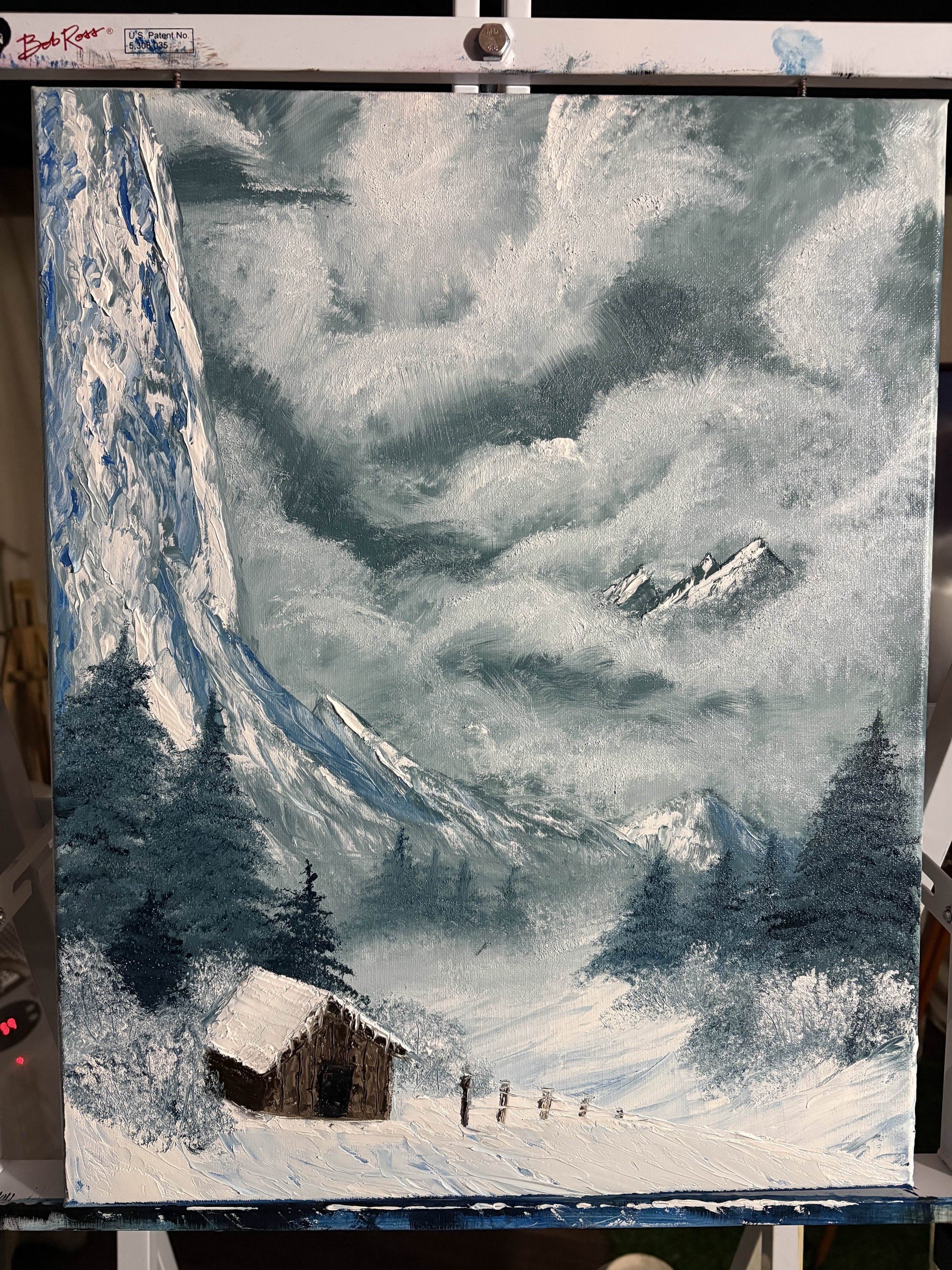 “Winter Mist” captures a quiet alpine landscape shrouded in drifting fog and falling snow. Soft layers of mist weave through distant mountains and evergreen trees, while a small cabin rests in the foreground, evoking solitude, warmth, and stillness. A serene original work that brings a sense of calm and depth to any space.